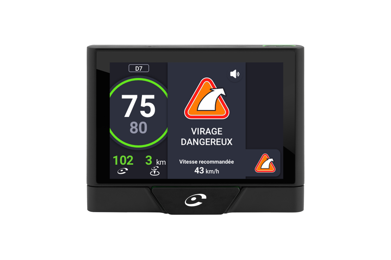 Basé sur un algorithme qui analyse les datas anonymisées de la Communauté, Sécurité Prédictive® contribue à une meilleure identification et prise de conscience des dangers. A chaque virage identifié comme dangereux*, le conducteur reçoit une alerte contextualisée qui lui recommande une vitesse pour prendre le virage en toute sécurité.